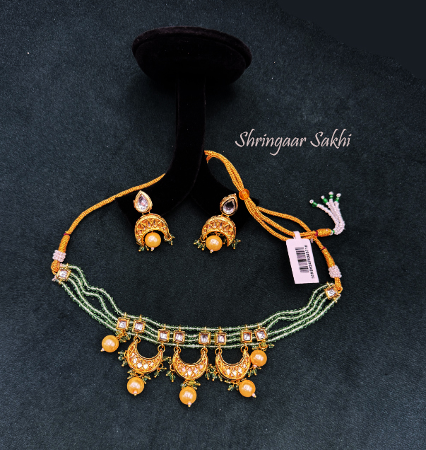 This exquisite choker necklace set features delicate green beads, intricately paired with gold crescent moon-shaped pendants adorned with kundan stones and pearl drops. The choker design is beautifully complemented by matching earrings, which showcase similar crescent and pearl detailing. Perfect for weddings, festive occasions, or traditional events, this set offers a refined blend of elegance and charm, adding a royal touch to any ethnic outfit.