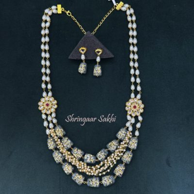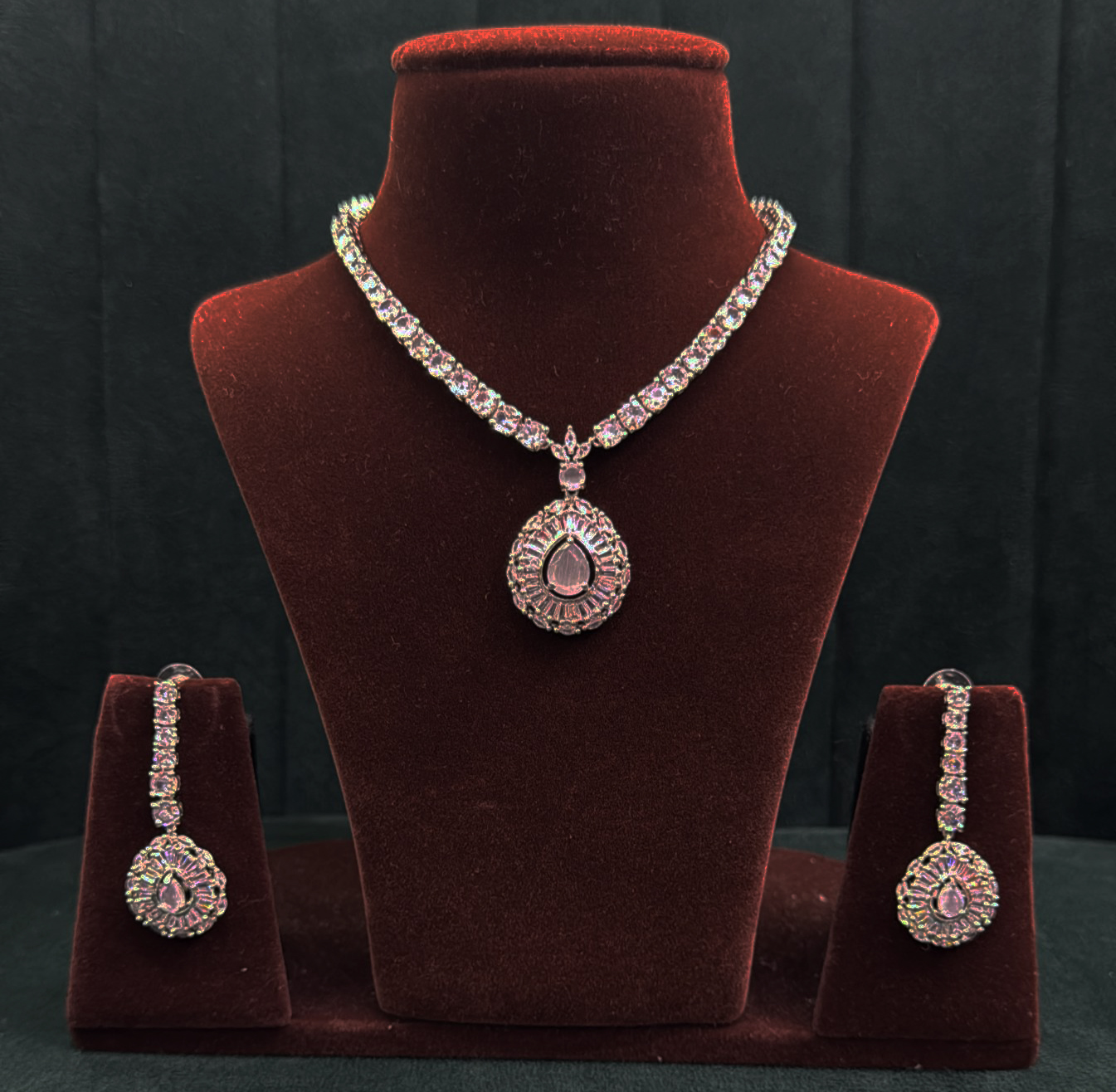 Ideal for festive occasions, weddings, or evening parties, this necklace set pairs beautifully with traditional Indian outfits like sarees, lehengas, or floor-length anarkalis. Opt for pastel or deep jewel-toned attire to highlight the pendant’s subtle pink undertone. Tie your hair in a bun or half-up hairstyle to showcase the earrings, and avoid wearing heavy accessories around the neckline to let this set stand out as the centerpiece of your look.