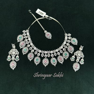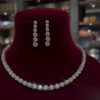 This exquisite necklace set is a beautiful blend of classic elegance and statement design. The necklace features a sparkling chain of meticulously set stones leading to a bold, intricately crafted pendant with a teardrop-shaped center stone encased in a decorative circular frame. Matching earrings mirror the pendant’s design, adding symmetry and charm to the ensemble. The combination of shimmering stones and delicate detailing gives this set a regal, vintage-inspired appeal.