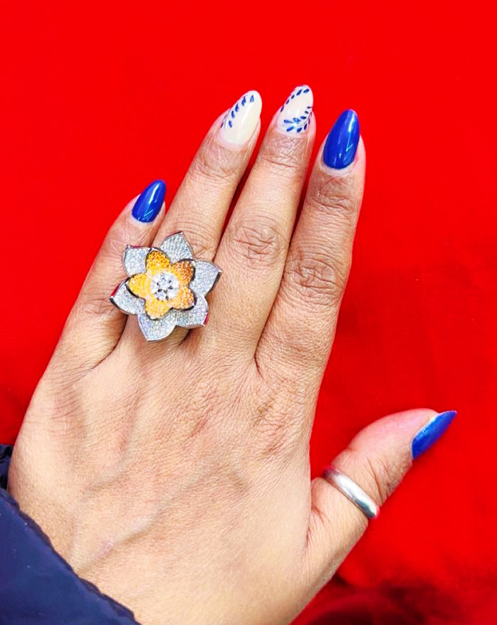 This vibrant finger ring captures the essence of floral elegance with its dual-tone petal design. The outer silver petals, encrusted with shimmering stones, gracefully encase the golden-yellow inner petals, which add a warm and radiant contrast. At the center, a brilliant white crystal adds a luxurious focal point, making this ring an eye-catching accessory. Its unique color combination and floral form make it a perfect blend of charm and sophistication.