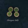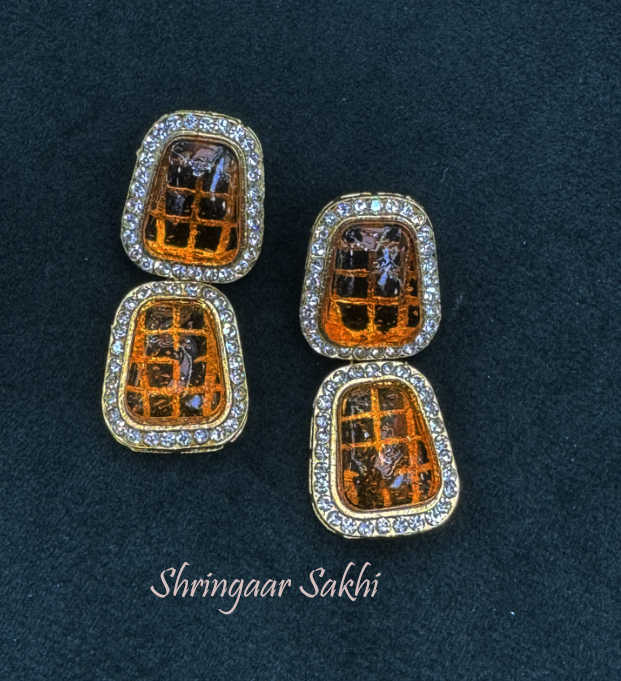 These striking Shringaar Sakhi earrings feature two amber-toned stones, each with a textured grid-like design, framed by a border of sparkling stones. The dual-stone design creates a bold, glamorous statement, with the rich amber hues perfectly contrasted by the glimmering borders. These earrings are ideal for adding a touch of luxury to both casual and formal outfits.