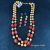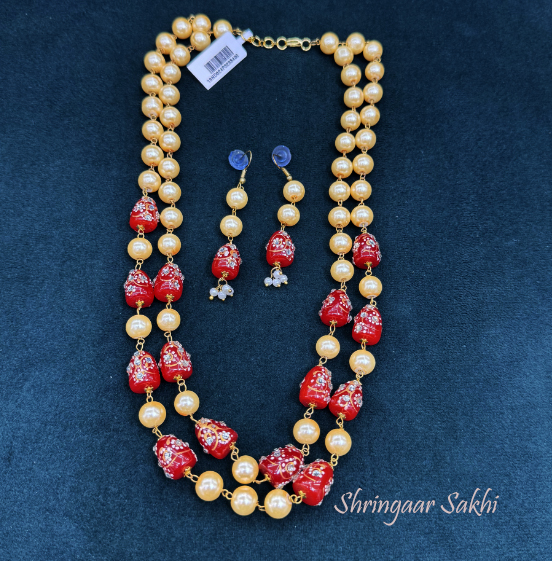 This elegant necklace set features two strands of luminous pearls, beautifully accented with red enamel beads adorned with intricate kundan work. The matching drop earrings add a touch of sophistication, making this set perfect for formal events or festive occasions. The contrast of pearls and red beads creates a striking look, offering timeless elegance with a modern twist.