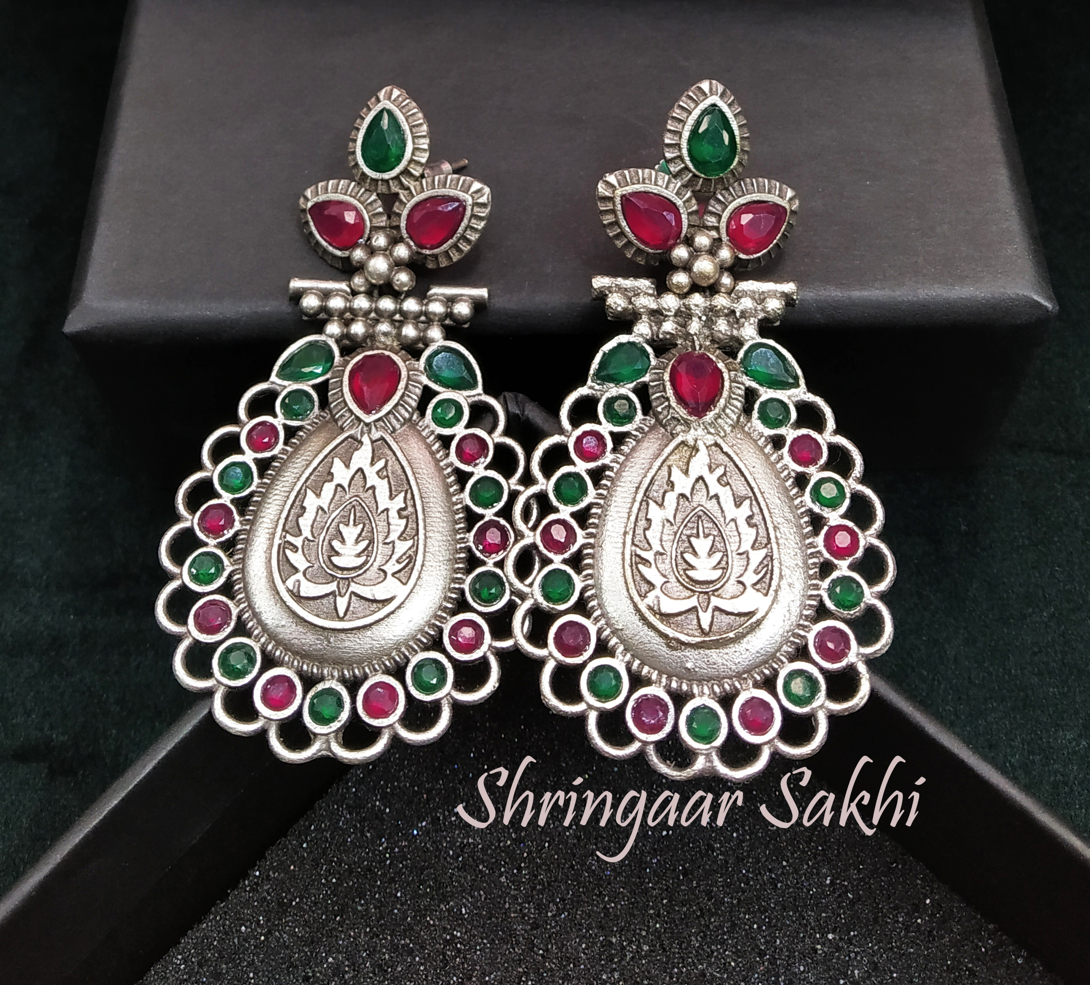Elevate your ethnic style with these intricately crafted oxidized silver earrings from Shringaar Sakhi. Featuring a beautiful teardrop-shaped centerpiece with a traditional temple motif, these earrings are adorned with alternating green and magenta stone accents that add a vibrant pop of color. The ornate floral border and detailed top design create a regal yet earthy appeal, making them a perfect choice for festive occasions, poojas, or traditional celebrations. Lightweight and striking, these earrings offer timeless elegance with a touch of cultural heritage.