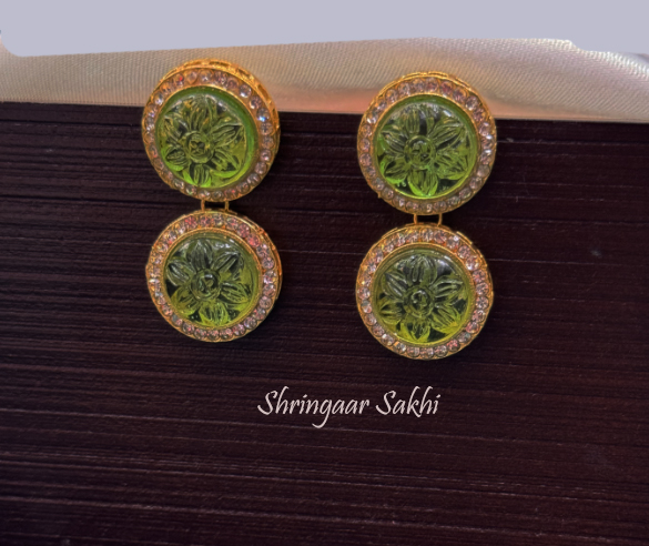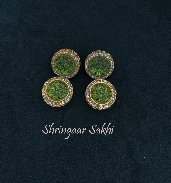 These elegant Shringaar Sakhi earrings feature intricate parrot green carving stone encased in a round frame, adorned with a border of sparkling stones. The vibrant green hue contrasts beautifully with the shimmering stones, creating a luxurious and eye-catching design that exudes timeless sophistication.