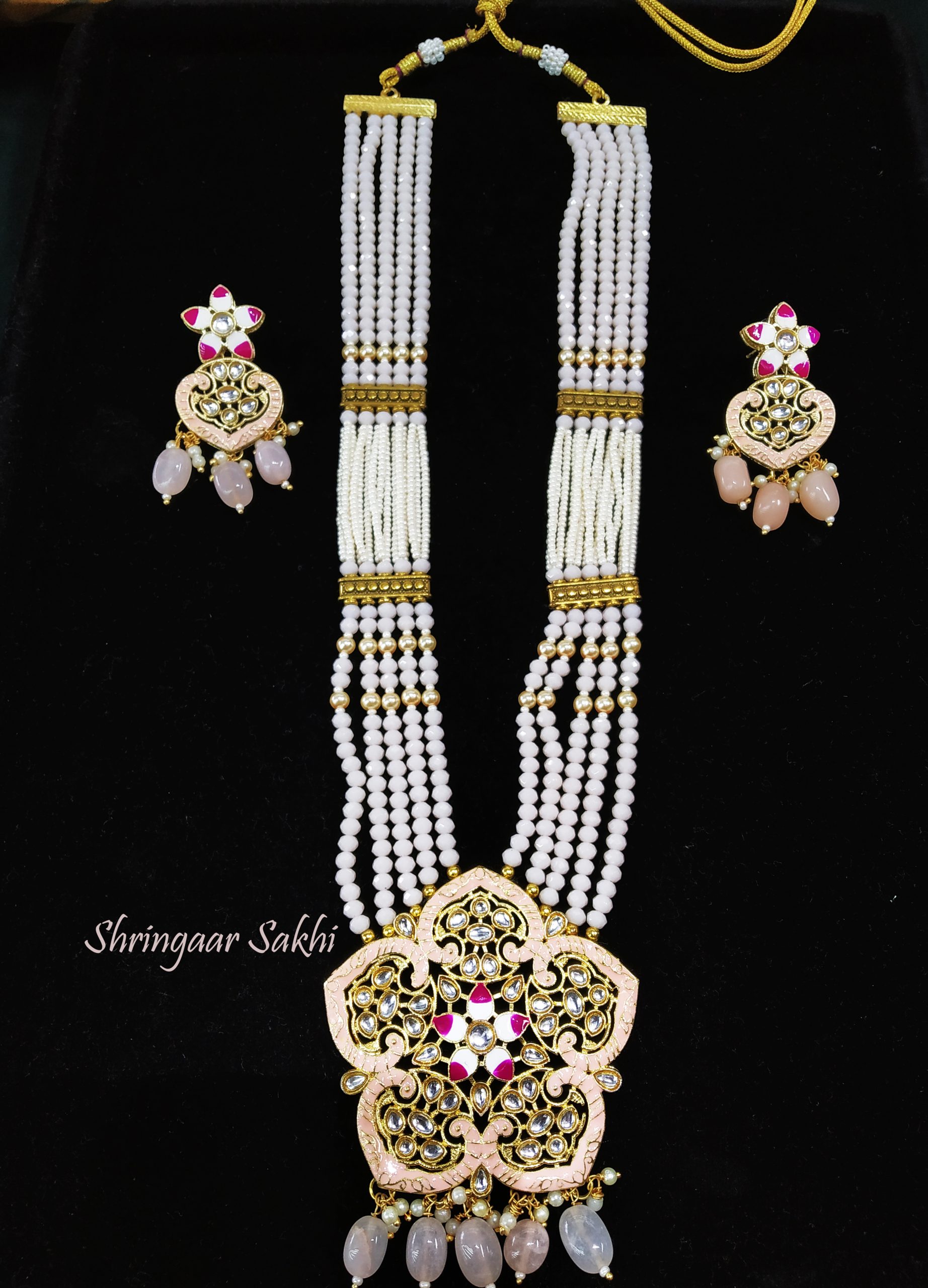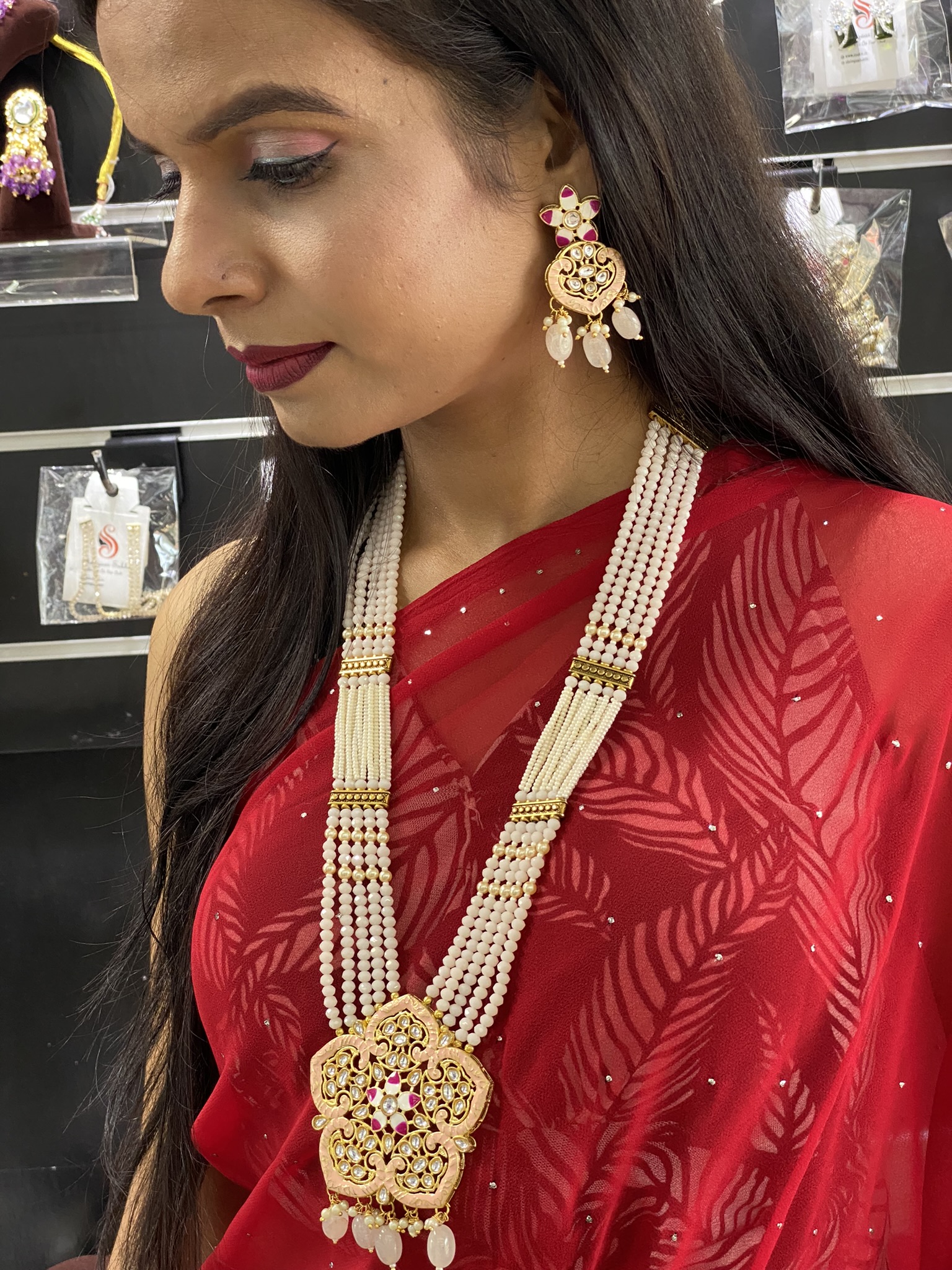 This exquisite jewelry set features a regal necklace with multiple strands of small, white pearl beads and a large, ornate gold pendant adorned with kundan and ruby-red stonework. The pendant is further enhanced with delicate hanging pearl drops, adding movement and charm. The matching earrings mirror the design with floral motifs, intricate gold detailing, and pearl drop accents, creating a cohesive and luxurious look.