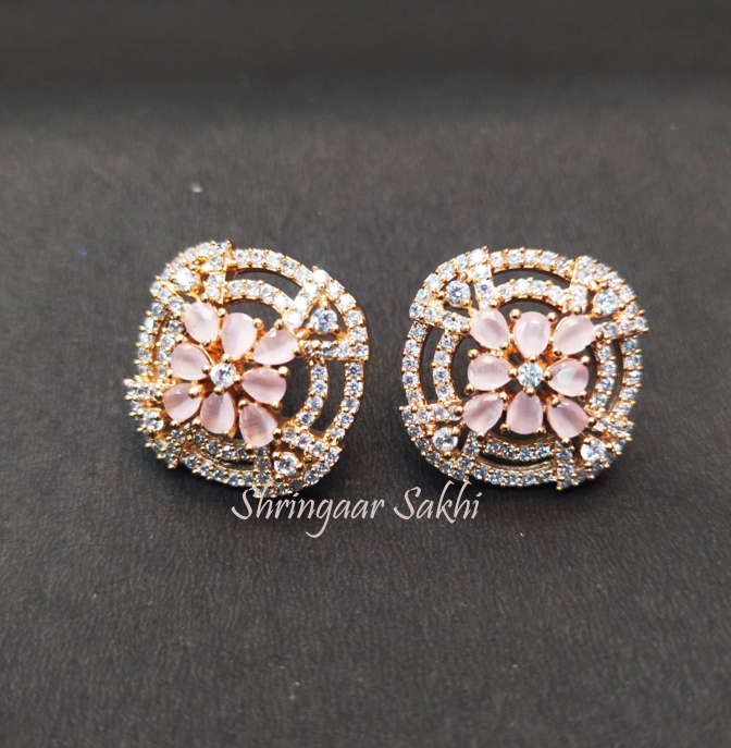 These elegant earrings feature a soft pink floral motif at the center, surrounded by a stunning frame encrusted with sparkling stones in a gold-toned base. The combination of the delicate pink stones and the shimmering crystal accents gives the earrings a luxurious and feminine appeal.