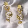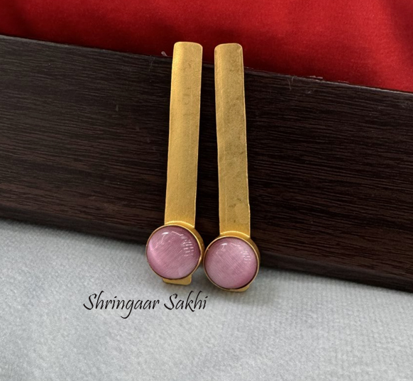 These modern and minimalistic earrings feature a sleek gold vertical bar design with a soft pink round stone at the base. The matte gold finish and pastel pink stone create a chic, understated look, perfect for both casual wear and formal occasions. The combination of bold lines and delicate color makes these earrings a versatile piece, ideal for anyone looking to add a subtle yet stylish touch to their ensemble.