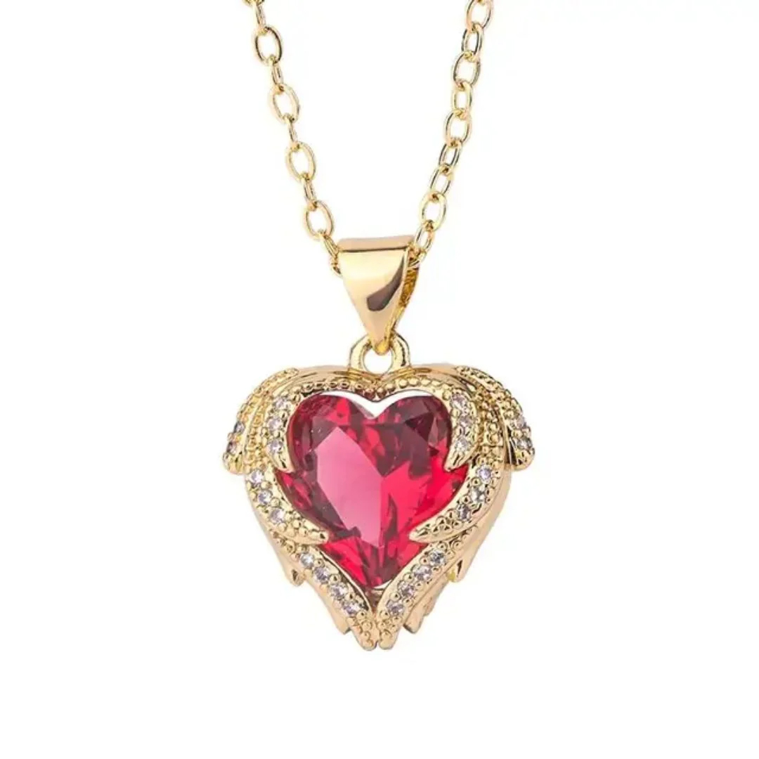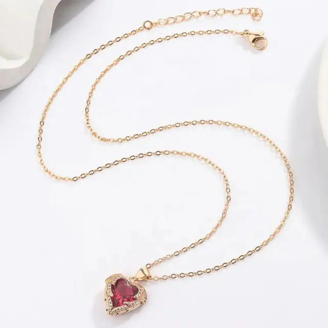 This necklace features a captivating heart-shaped red gemstone encased in an intricately designed gold-toned frame adorned with sparkling crystals. The rich crimson hue of the centerpiece exudes passion and elegance, while the golden detailing adds a touch of vintage glamour. The pendant hangs delicately from a fine gold-toned chain, making it a romantic and luxurious piece that stands out effortlessly.