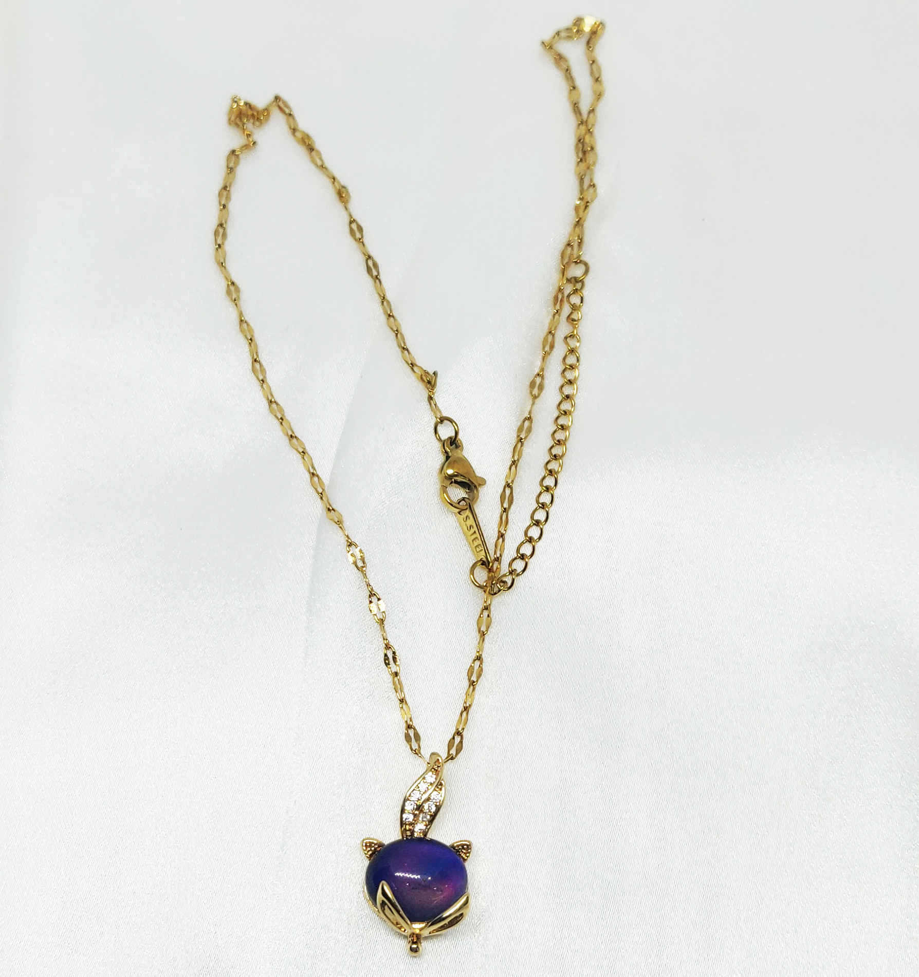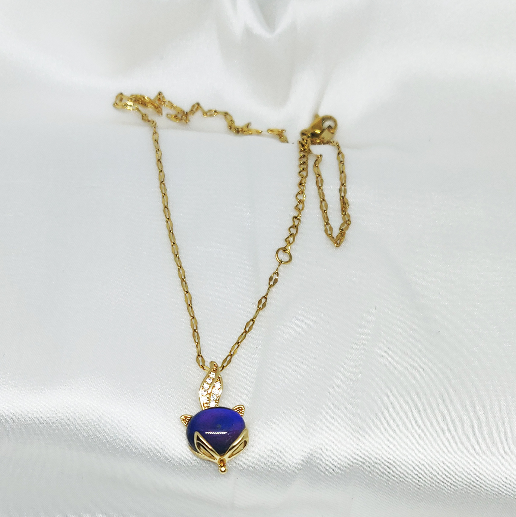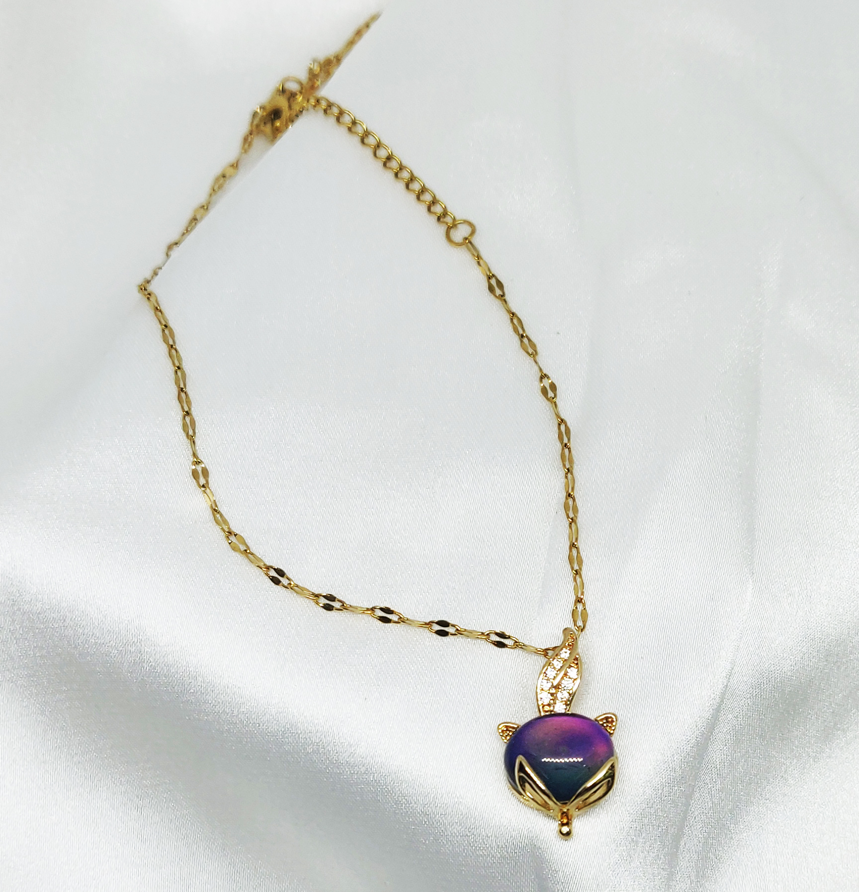 This charming gold chain features a whimsical fox pendant adorned with a smooth, multicolored iridescent stone that shifts hues in the light. The pendant is detailed with tiny ears, sleek gold accents for the snout, and a glittering crystal-embellished tail, all crafted in a glossy gold finish. The delicate yet sturdy chain perfectly complements the playful elegance of the pendant, making it a standout piece.