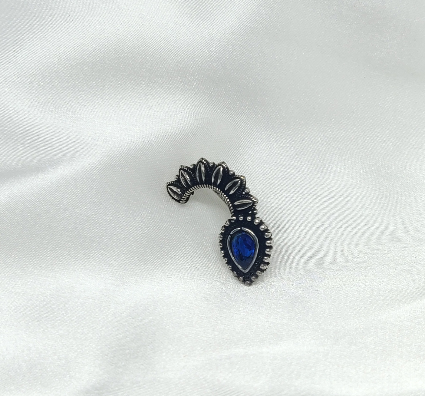 This stunning oxidised Maharashtrian Nath features a unique half-moon curve design adorned with intricate petal-like engravings, leading down to a blue stone centerpiece. The oxidised silver finish adds a vintage charm, making it an eye-catching piece rooted deeply in traditional Maharashtrian heritage. Its lightweight and clip-on design make it comfortable and easy to wear, even without a piercing.
