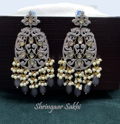 These striking earrings feature intricate silver-toned filigree work adorned with sparkling stones and are accentuated by delicate pearl drops. The additional layer of grey bead dangles adds a contemporary twist, making them a versatile choice for both traditional and modern outfits. The blend of pearls and metallic detailing gives these earrings a luxurious yet balanced appeal, ideal for festive occasions or weddings.