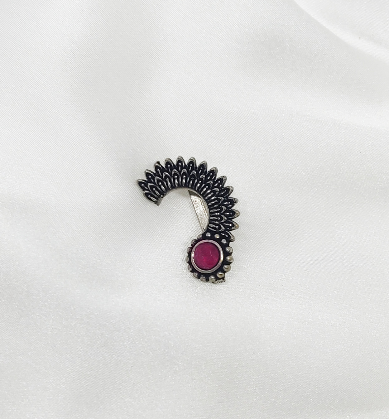 This stunning oxidised Maharashtrian Nath features a unique half-moon curve design adorned with intricate petal-like engravings, leading down to a ruby stone centerpiece. The oxidised silver finish adds a vintage charm, making it an eye-catching piece rooted deeply in traditional Maharashtrian heritage. Its lightweight and clip-on design make it comfortable and easy to wear, even without a piercing.
