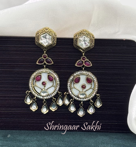 These earrings feature a stunning blend of traditional and contemporary design elements. The circular centerpiece is adorned with delicate ruby and white enamel work, surrounded by intricate detailing and crystals that add a touch of elegance. Dangling crystal drops enhance the movement and sparkle, making this a timeless piece perfect for festive or formal occasions.