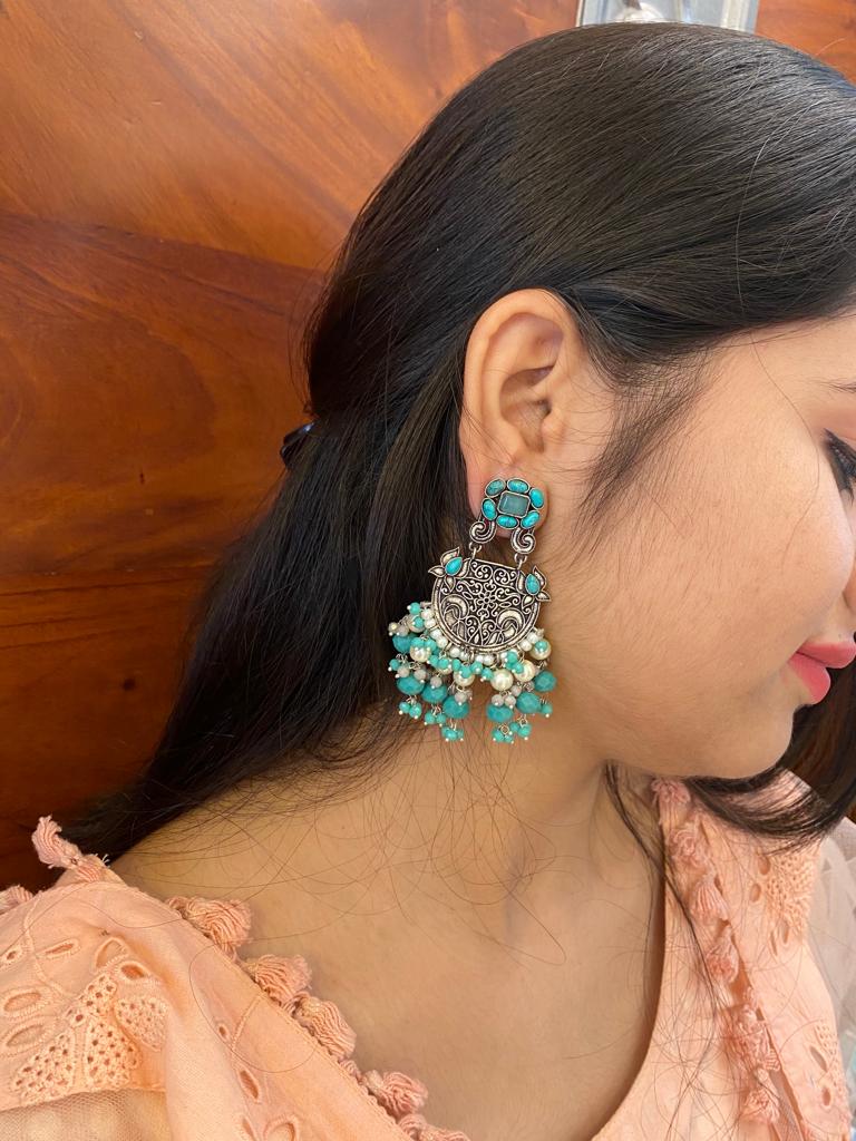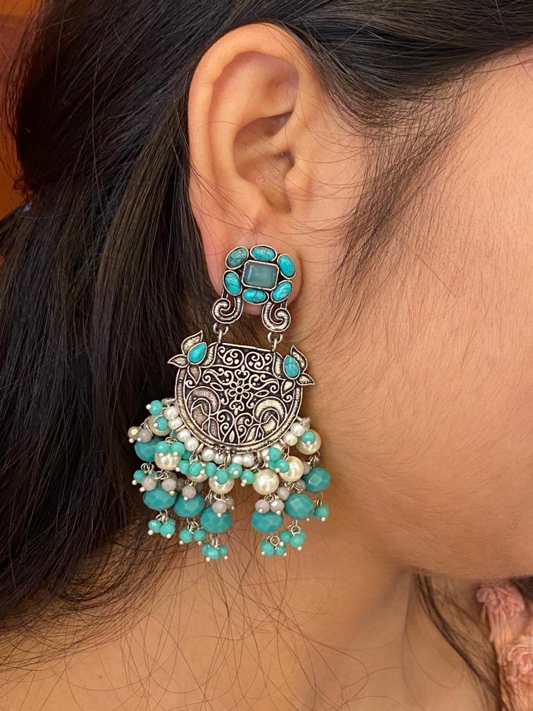 These oxidized silver earrings feature an intricate round motif with engraved floral patterns and a top stud adorned with turquoise stones. The lower fringe is beautifully detailed with aqua blue beads and white pearls, giving it a fresh, elegant look.