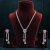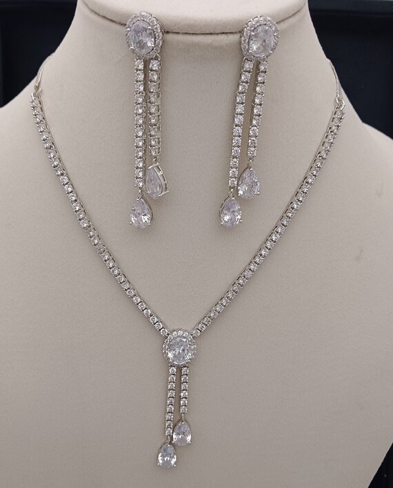 This dazzling necklace set features a sleek, V-shaped design adorned with rows of radiant cubic zirconia stones. At its center, a large circular motif adds a bold focal point, from which two elegant, stone-studded strands drop gracefully, each ending in a sparkling teardrop-shaped gem. The matching earrings replicate this cascading design, creating a perfect balance of modern glamour and traditional elegance. The intricate arrangement and brilliant cut of the stones ensure maximum sparkle from every angle.