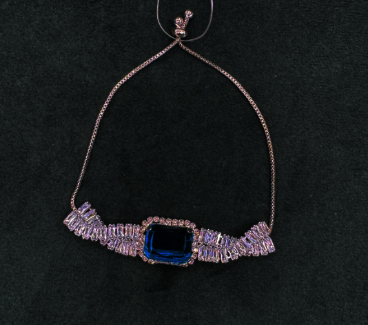 This exquisite bracelet is a stunning fusion of bold elegance and timeless glamour. At its center lies a dazzling royal blue rectangular stone, encased in a halo of radiant American diamonds. The intricate metal framework is polished in a silver tone, enhancing the brilliance of the surrounding stones and creating a regal contrast with the deep blue centerpiece. Its adjustable chain ensures a secure and comfortable fit, making it suitable for both formal occasions and festive wear.