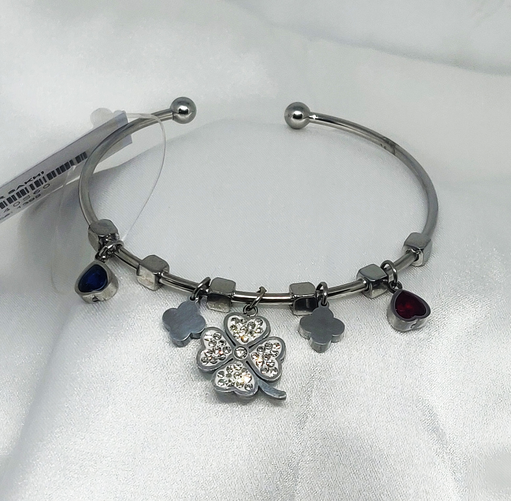Add a dose of charm and sparkle to your ensemble with this elegant silver-tone bangle bracelet by Shringaar Sakhi. Adorned with stylish cube spacers and delightful hanging charms — including a clover pendant embellished with clear stones, a petite flower, and a red heart-shaped gem — this open-cuff style bracelet perfectly blends modern minimalism with playful femininity. It’s a trendy yet timeless piece that suits every mood and occasion.