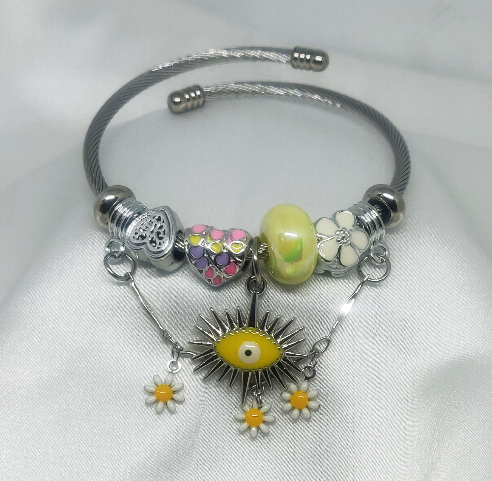Make a bold and boho-chic statement with this silver-toned evil eye charm bracelet from Shringaar Sakhi. Featuring a vibrant pop of yellow and floral enamel detailing, this piece combines modern symbolism with playful elegance. The central evil eye charm, surrounded by dangling daisy charms, is believed to ward off negativity while adding a splash of color and style to your ensemble.