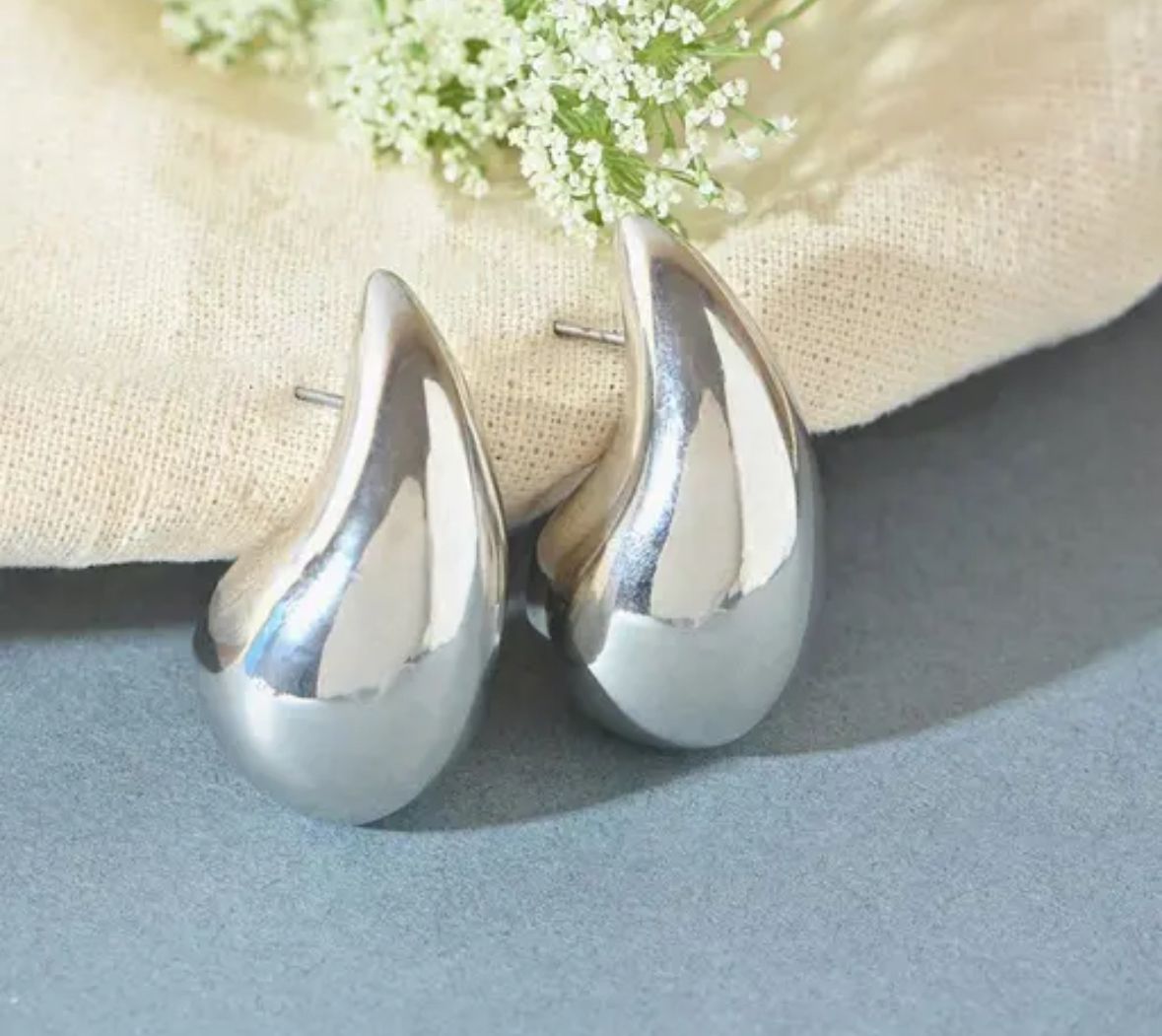 These sculptural silver-tone drop earrings feature a modern teardrop silhouette with a high-shine mirror finish. Their fluid, minimalist shape is both bold and elegant, making them a standout accessory for contemporary fashion lovers. Lightweight yet impactful, they offer an artistic flair that effortlessly elevates any look.