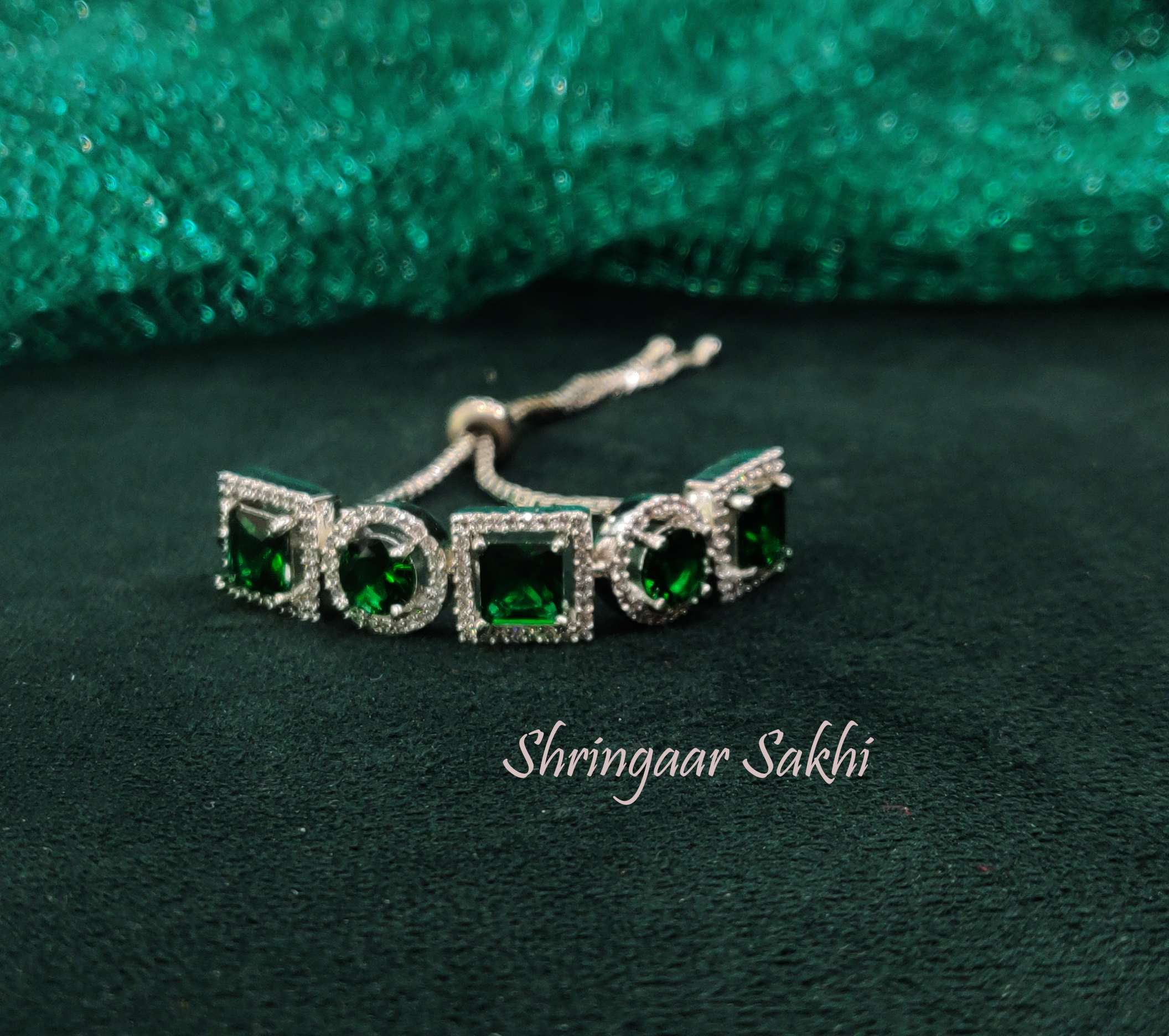 Elevate your elegance with this Emerald Green Stone Bracelet, a stunning piece that seamlessly blends luxury and sophistication. Featuring alternating square and round emerald-green stones, each encased in a halo of sparkling white crystals, this bracelet sits on a sleek silver-toned adjustable chain for a perfect fit. The radiant green stones exude a royal charm, while the crystal accents add a dazzling touch of glamour. Its slider clasp ensures both comfort and style, making it a versatile addition to any jewelry collection.