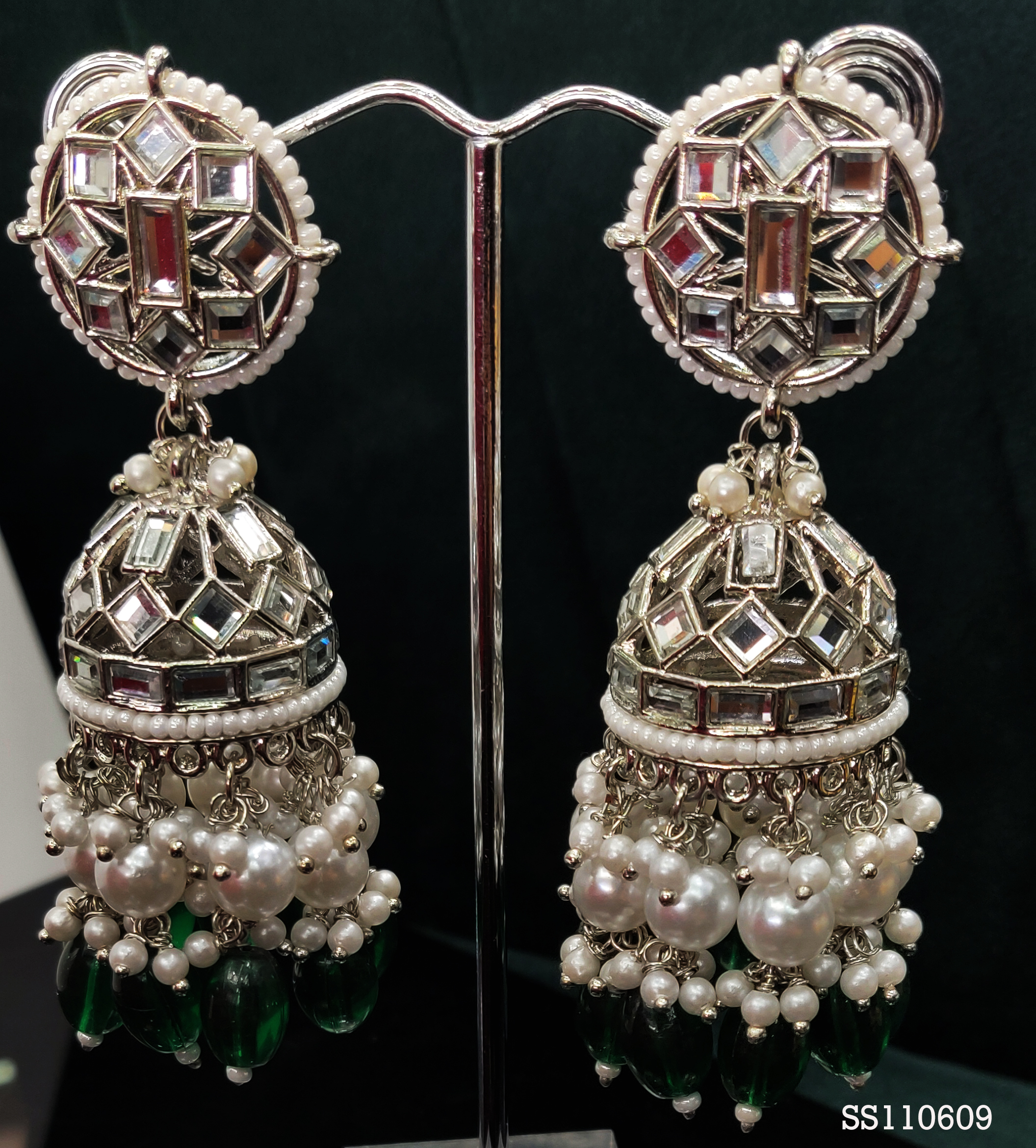 These exquisite jhumka earrings are a perfect blend of tradition and elegance. The design features a round, mirror-studded top that leads into a dome-shaped jhumka adorned with intricate mirror work and finished with clusters of white pearls and deep green beads. The sparkling American diamonds and detailed silver framework give the earrings a regal touch, while the contrast of white and green beads adds a refreshing pop of color. Delicately crafted, these earrings are ideal for festive occasions, weddings, or any celebration where you want to make a graceful style statement.