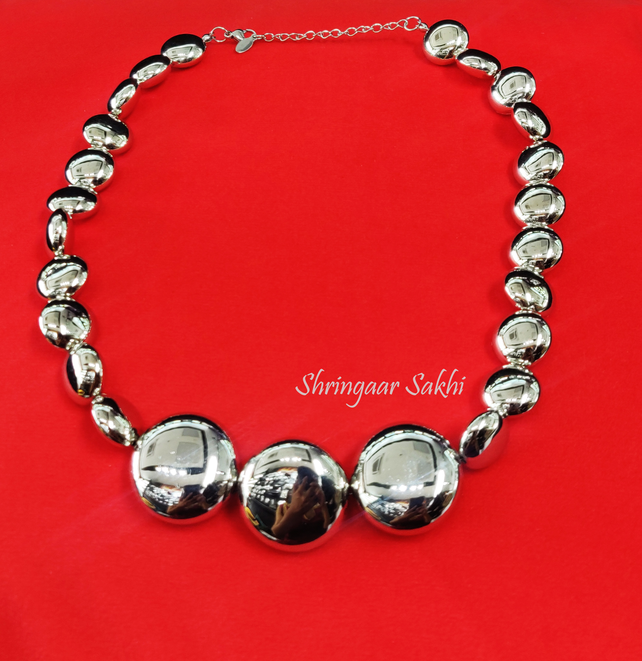 Elevate your style with our exquisite silver metal stone mala. Crafted with precision, this necklace features a captivating arrangement of shimmering silver metal stones. Each stone reflects light with an enchanting brilliance, creating a cascade of elegance around your neckline. The mala exudes a timeless allure, making it a versatile accessory that effortlessly complements both casual and formal ensembles. Embrace the enchanting beauty of silver metal stones and let this mala become a symbol of your sophisticated style.
