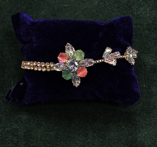 This striking bracelet showcases a stunning floral arrangement at its center, featuring marquise-cut crystals in soft pink & green tones, enhanced by radiant clear stones that shimmer with every movement. The symmetrical design is both romantic and modern, set on a dual-row silver chain that adds richness and structure to the piece. The side embellishment gives the bracelet a whimsical, asymmetrical edge, elevating its uniqueness.