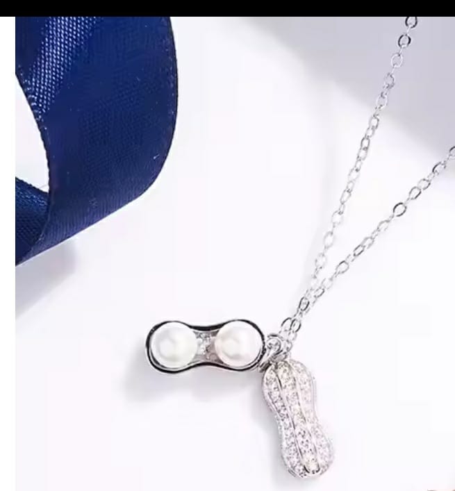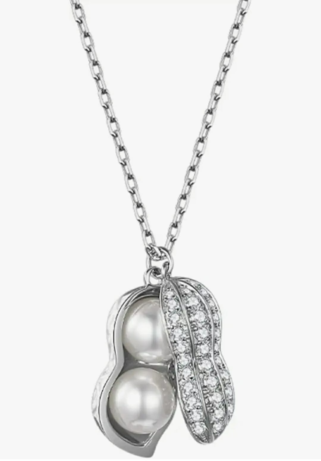 This charming necklace features a unique design inspired by nature—a silver-tone pendant shaped like a pea pod, delicately holding two lustrous pearl-like beads. One half of the pod is encrusted with sparkling crystals, adding a touch of elegance and glamour to its playful concept. The fine silver chain complements the pendant beautifully, making it a whimsical yet sophisticated piece.