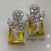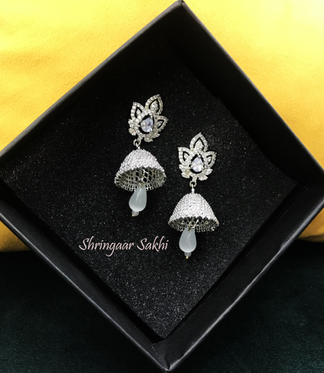 A stunning American Diamond Jhumki featuring a prominent, high-quality grey stone. The elegant design showcases brilliant American Diamonds set on a polished sterling silver base. The centerpiece is a dangling grey stone, expertly cut for maximum allure. This medium-sized Jhumki is meticulously crafted with a secure hook closure—perfect for special occasions or adding a touch of glamour to everyday wear.