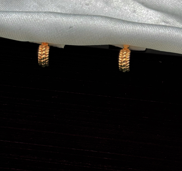 These earrings feature a gold finish with an intricate, textured design that gives a unique look of depth and elegance. The circular balis have a rich sheen and are slightly thicker, which makes them ideal for making a statement without being too bold. Their compact size makes them versatile—perfect for both casual and formal settings.