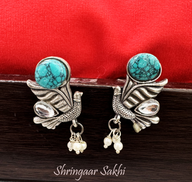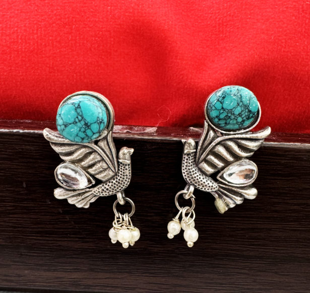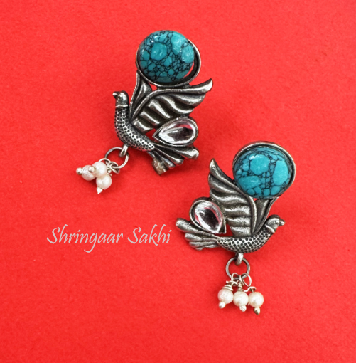 These unique earrings feature a striking turquoise stone paired with intricate silver bird motifs. The design includes delicate pearl drops, adding a touch of charm and elegance. The combination of the turquoise stone and silver creates a bold yet vintage-inspired look, perfect for standing out.