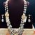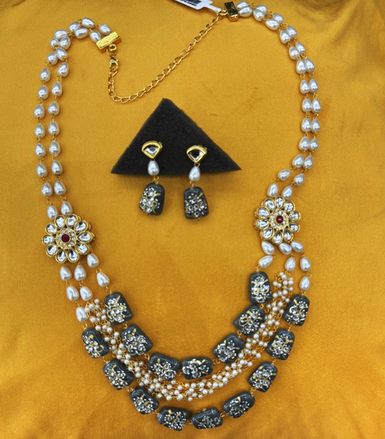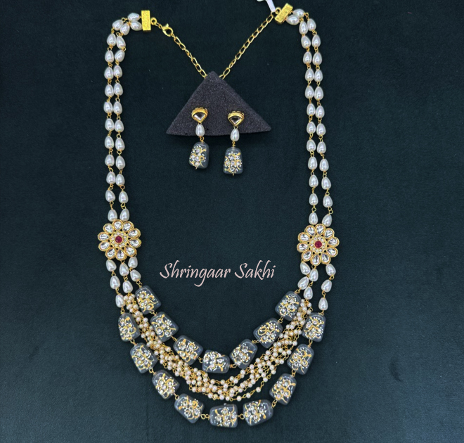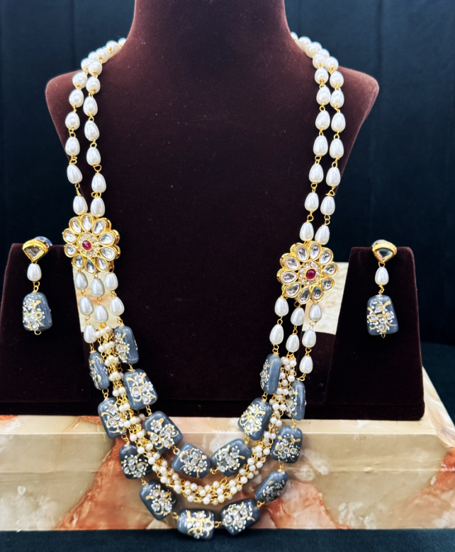 This luxurious necklace set features dual layers of pearls with intricate kundan work and grey-toned beads, each adorned with delicate floral designs. The set includes matching earrings, making it perfect for weddings or festive occasions. A stunning choice for those seeking traditional elegance with a regal touch.