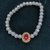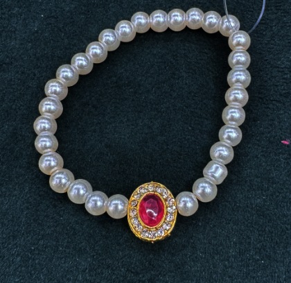 This elegant bracelet features a classic string of pearl-finished beads, highlighted by a stunning centerpiece — an oval red gem encased in a gold-toned frame embellished with tiny, sparkling stones. The design radiates a royal charm, blending timeless sophistication with a touch of bold color. The lustrous pearls offer a soft, graceful appeal, while the vibrant red centerpiece adds a rich focal point that draws the eye.