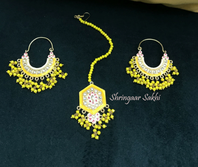 This bright and festive jewelry set includes hoop-style earrings and a matching maang tikka, featuring golden mirror work, pink floral detailing, and cheerful yellow bead tassels. The design is playful and vibrant, making it perfect for traditional occasions like haldi ceremonies and festive events.