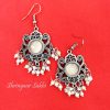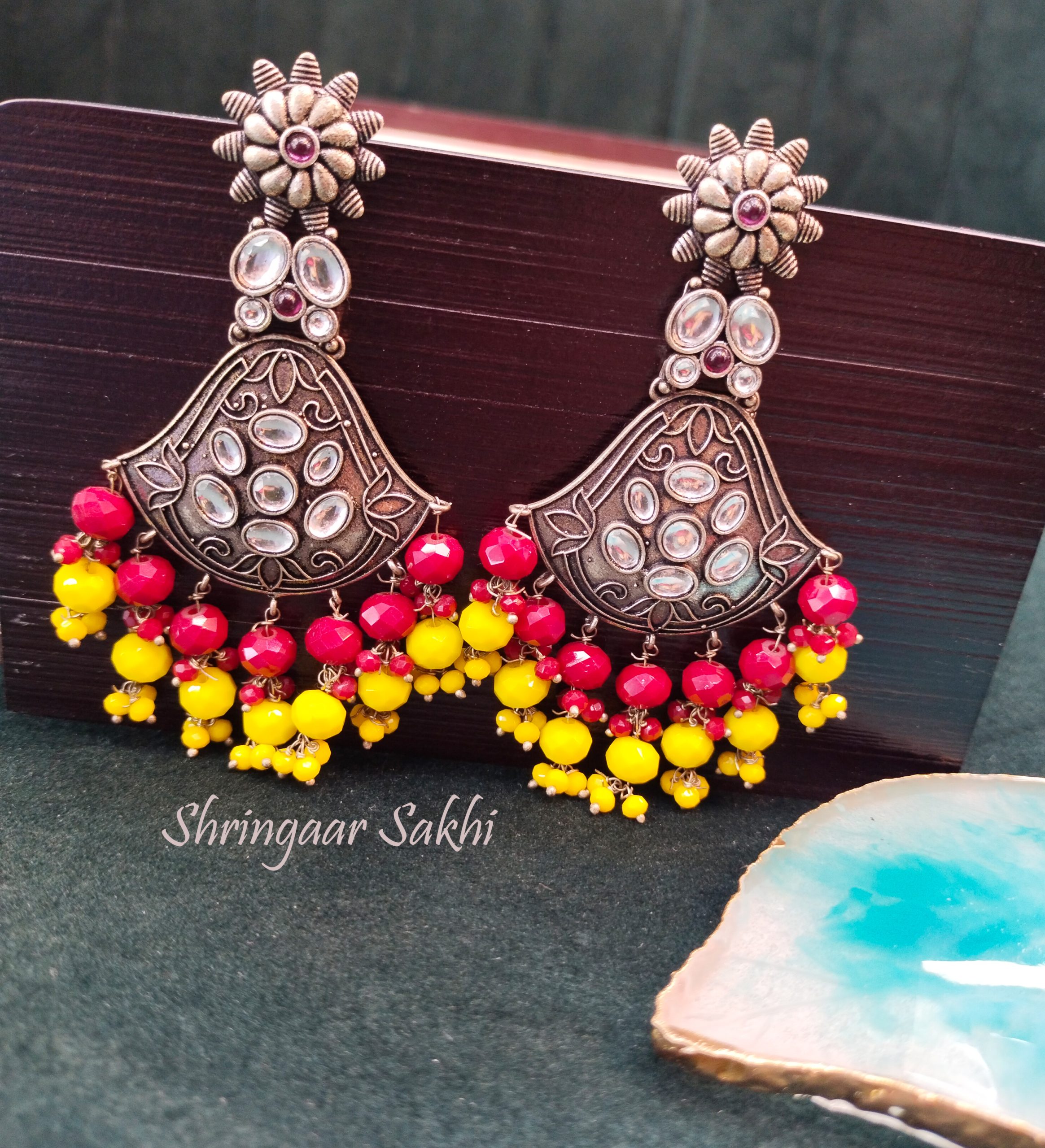 These oxidized silver earrings feature a unique peacock-inspired design, adorned with white kundan stones and vibrant red and yellow bead hangings. The floral stud top and intricate detailing add a traditional touch, making them eye-catching and festive.